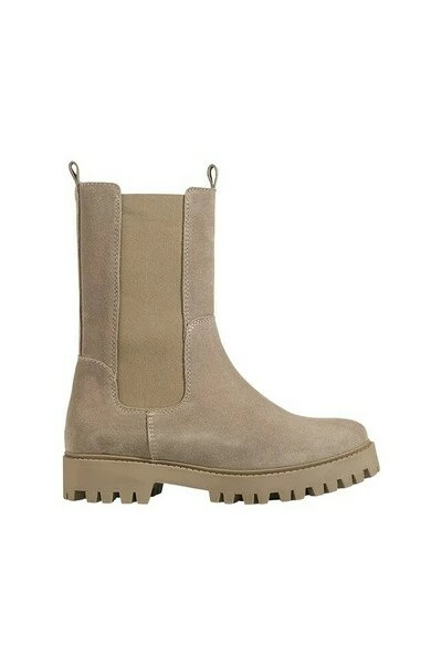Chelsea enkellaarsjes Deze chelsea enkellaarsjes in beige voor dames zijn aan de buitenzijde van suède en aan de binnenzijde volledig van leer. Helemaal hot met de grove zool! De maat valt iets ruimer dan normaal. De hakhoogte is 2.5 cm en is gemeten vanaf de hiel. De plateauhoogte is 2 cm.
