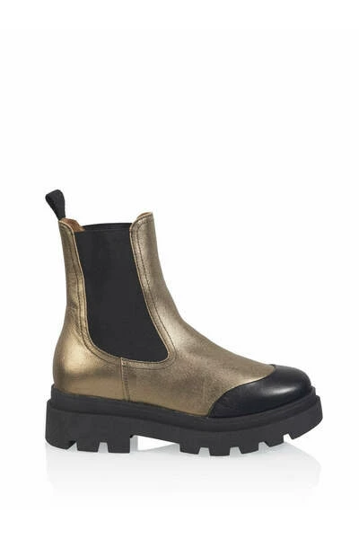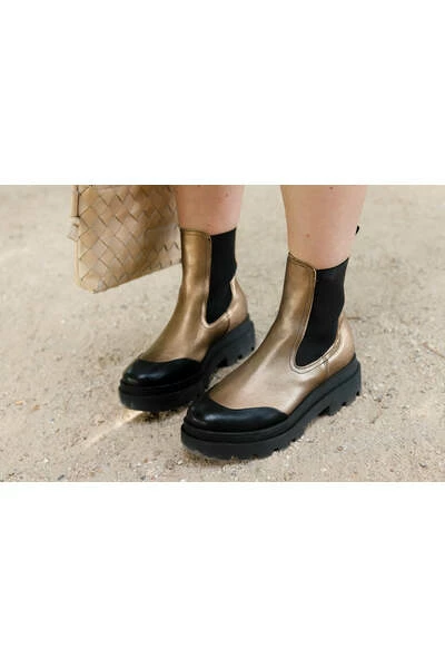 Bronze biker enkellaarsjes Deze chelsea enkellaarsjes in de kleur Smoke / bronze voor dames zijn aan de buitenzijde en aan de binnenzijde volledig van leer. Helemaal hot met de grove zool! De maat valt normaal en de hakhoogte is 2.5 cm en is gemeten vanaf de hiel. De plateauhoogte is 2 cm. De Praag heeft een lichtgewicht zool en lopen dus als wolkjes!