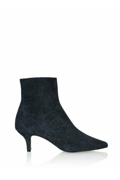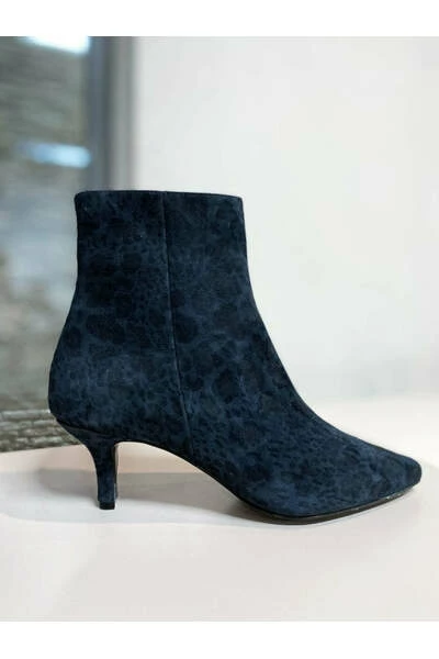 Donkerblauwe suède enkellaarsjes met panterprint op de hak. Deze laarzen met luipaardprint zijn stijlvolle laarzen voor dames.