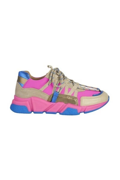Roze met blauwe Los Angeles sneaker Deze sneakers zijn net wat meer speciaal door de veter die ook over de neus loopt. Voor de dames met oog voor detail. We love it! Deze sneaker is aan de buitenzijde van leer, mesh ; suède en binnenzijde volledig van leer. De schoen heeft een uitneembare binnenzool van leer voor extra comfort. Doe mee met de trend! MAATADVIES De Los Angeles sneaker valt iets korter in de lengte en smaller in de breedte dan je van ons gewend bent. Val je normaal tussen 2 maten in? Dus draag je normaal 37,5 bestel dan een 38!